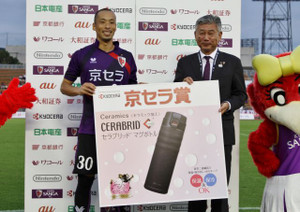 この日は京都銀行スペシャルデーという事もあって、試合前にサンガのキャプテン、吉野選手に京都銀行の土井伸宏頭取から花束の贈呈
